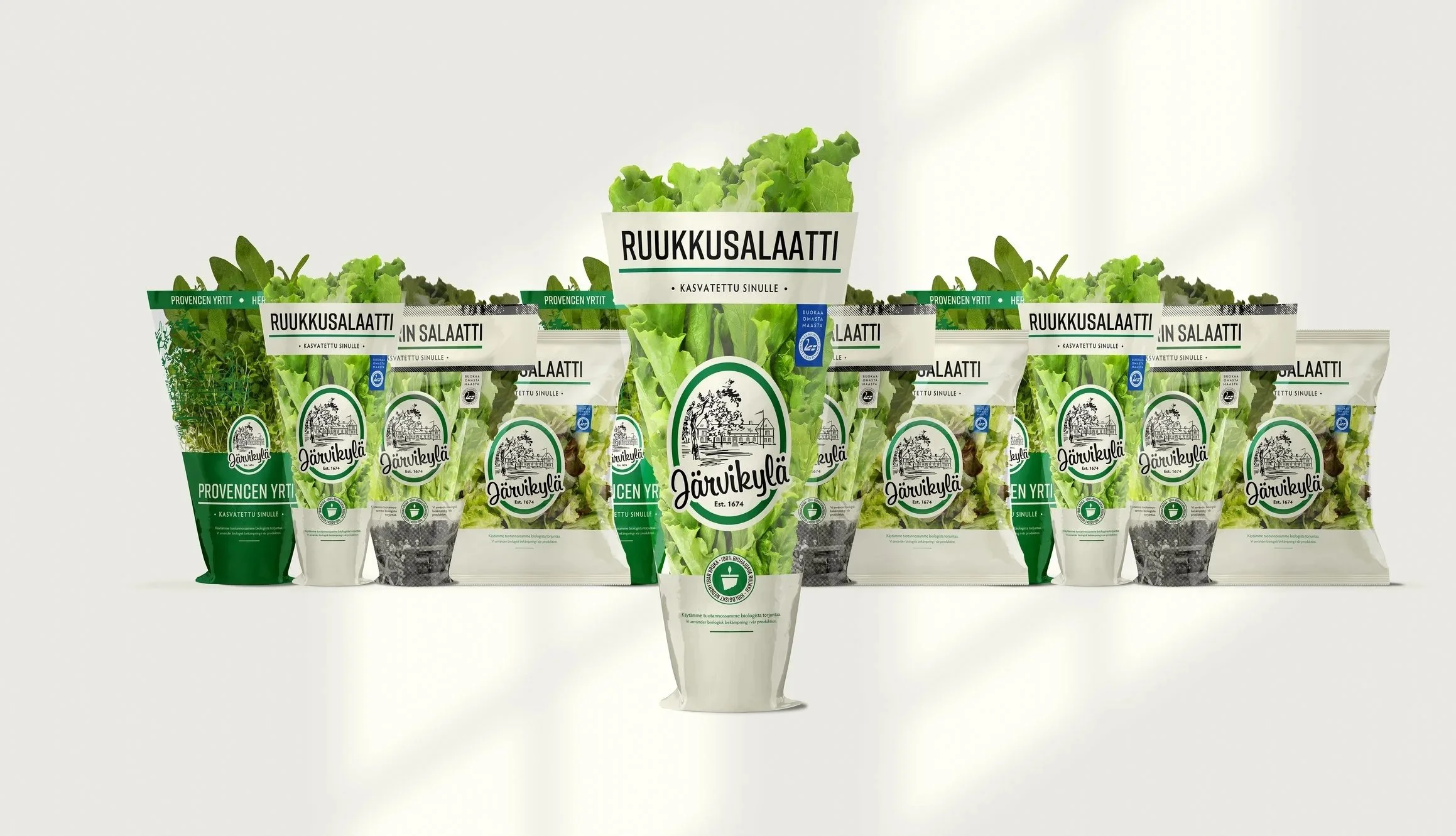 The phrase “Kasvatettu sinulle” (“Grown for you”) beneath each product name adds a personal touch and reminds consumers of the care behind every herb. Natural imagery, a simplified logo, and an more natural/fresh colour palette connect the brand back to its real origin, the historic Järvikylä estate.